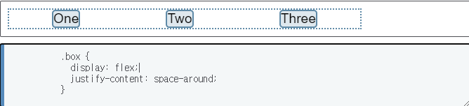 space-around : 요소들 사이에 동일한 간격을 두고 , 좌우 끝에 요소 사이 간격의 반만 둔다.
