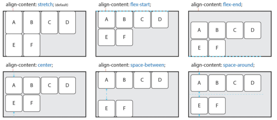 | align-content | 교차 축(cross-axis)의 정렬 방법을 설정 |