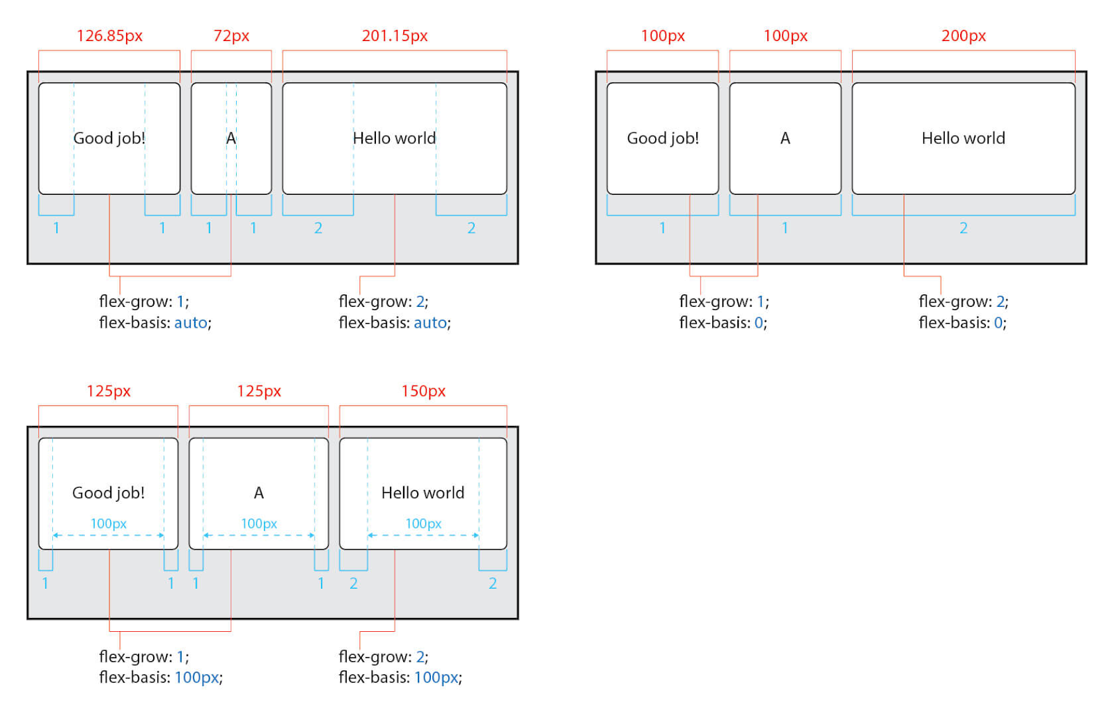 각각의 flex-grow 값이 1 2 1 / 1 3 2 였을 시 아래와 같다.